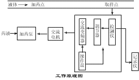 加藥泵電機(jī)在交流變頻器驅(qū)動(dòng)下,將藥劑注入到液體中,藥濃度被檢測儀檢測,檢測儀將與濃度成比例的電信號(hào)輸入到調(diào)節(jié)器與設(shè)定值比較,得到偏差信號(hào),調(diào)節(jié)器將偏差信號(hào)按工藝要求進(jìn)行比例、積分運(yùn)算,其運(yùn)算結(jié)果信號(hào)輸送給變頻器,變頻器按調(diào)節(jié)器輸出的調(diào)節(jié)信號(hào)改變電機(jī)工作電源的頻率,使電機(jī)轉(zhuǎn)速發(fā)生變化,改變注入液體中藥液濃度,使藥劑濃度控制在要求范圍內(nèi)。